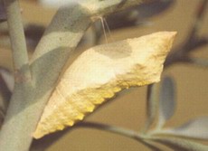 ע"ג הצמח אותו אכל. הגולם עצמו דבוק לעצם הנבחר בקצהו התחתון ותלוי בקצהו העליון בשני קורים דקים. |