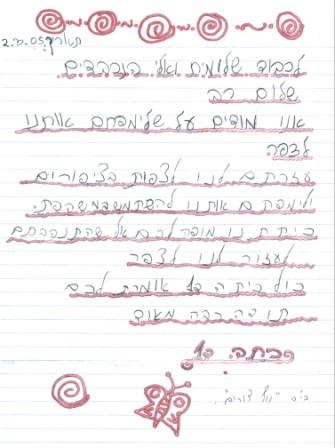 אחד ממכתבי התודה של תלמידי כתה ד'
