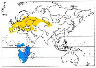 צהוב - אזורי ההמצאות בקיץ. כחול – תקופת