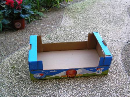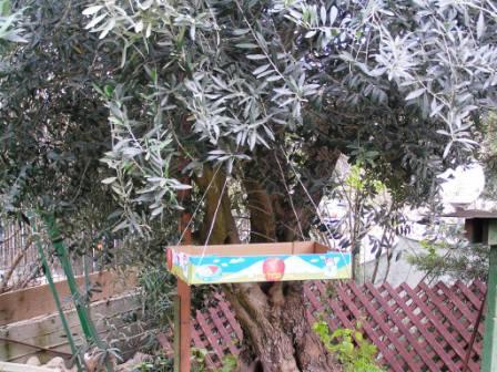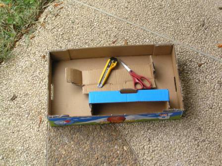 בנית שולחן האכלה מקרטון פירות: 3. משחילים חוטים ותולים על ענפי העץ. רצוי חוטי ברזל או שרשרת ואפשר לקבע צד אחד לעץ. הציפורים אוהבות שולחן האכלה יציב. אפשר לצבוע בצבעי סופרלק וכדומה להגנה מפני בליה מהירה של הקרטון. |